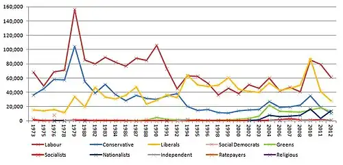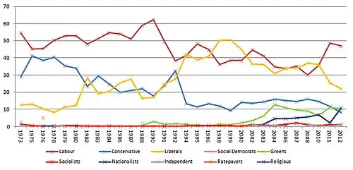 The seats were redistributed into 24 wards in 1930, and the Citizens Association renamed itself the Progressive Party, and a further seat was added for Norton in 1934, taking the total number of positions to 75 councillors and 25 aldermen. That year, Labour briefly lost control, but regained it in 1934, with an increased majority of 12. This rose to 14 the following year. In 1945, Labour had 59 total seats to the Progressive's 39, one independent and one Communist. Labour continued to build its majority, to 34 in 1952 and 42 by 1958.[1] However, it lost control to the Conservative Party, again standing on its own, in 1968-9.