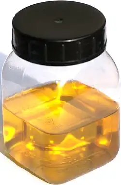 The raw shellac, which contains bark shavings and lac bugs removed during scraping, is placed in canvas tubes (much like long socks) and heated over a fire. This causes the shellac to liquefy, and it seeps out of the canvas, leaving the bark and bugs behind. The thick, sticky shellac is then dried into a flat sheet and broken into flakes, or dried into "buttons" (pucks/cakes), then bagged and sold. The end-user then crushes it into a fine powder and mixes it with ethyl alcohol before use, to dissolve the flakes and make liquid shellac.[12]