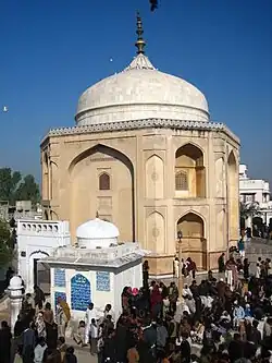 The town is well known all around the Punjab, for a famous late-sixteenth century Qadiriyyah Sufi saint, Daud Bandagi Kirmani, who lived and died in the town. He was born in Sitapur, village of modern-day Muzaffargarh District.His family had migrated from Kerman Province in Persia, and claimed descent from Prophet Mohammad.After receiving his formal religious and spiritual education from the pirs of Uch, he established himself in Shergarh, where he lived from then on until his death. He converted many tribes in the present-day districts of Faisalabad, Sialkot Sheikhupura. Hafizabad, Sahiwal & Gujranwala, and although he lived in Shergarh, he did not carry out much of his work in that area because most of the native tribes, such as the Wattu and Joiya had already previously been converted by Baba Farid of Pakpattan. The tribes converted by Daud Bandagi Kirmani include mainly Arain,Rajput & Jat clans of the above-mentioned areas. Some of these are Virks, Bajwas, Cheemas, Chatthas & Sahis.He is claimed to have converted 35,000 people to Islam, and 365 people to sainthood in all. Some of his prominent murids include Bala Pir, 'Abd al-Qadir Bada'uni, Wahab Chishti & Kamal Chishti. The saint died in 1575, after which his nephew and son-in law, Shah Abul Mu'aali, had a beautiful, large mausoleum erected for his grave. This mausoleum is visited by many "murids" in the month of March, when his urs is held. Apart from his murids, the mausoleum attracts the attention of many curious travellers, artists & calligraphers all year round, as this mausoleum is one of the rare monuments in the country which has calligraphy and tile work in the "Naqashi style".[3] The shrine used to be in the care of the local "Gaddi Nashin" (eldest direct descendant), but after the land reforms of Ayub Khan, it was turned to the Auqaf Deptt., Okara.