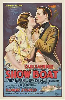 Show Boat is a 1929 American pre-Code sound part-talkie romantic drama film based on the 1926 novel Show Boat by Edna Ferber. The film initially did not use the 1927 stage musical of the same name as a source, but scenes were later added into the film incorporating two of the songs from the musical as well as other songs. Many of these songs from the stage show were featured in a special prologue that was added to the picture before it was released. This film was produced and released by Universal. Like the majority of films during the early sound era, a silent version was made for movie theatres that had not yet converted to sound.