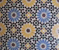 The patio is distinguished by a paving in white marble encrusted with black marble; it is framed by porticos which each have five broken oversized arches made of stone paired with ocher shellstone.[3] The arches rest on columns of white marble whose capitals are Hafsid or Hispano-Moorish.[4] The hypostyle-type prayer room is divided into three naves parallel to the wall of the qibla.[1][3] The whole building, including the zawiya and its outbuildings, covers a total area of almost 2,700 square metres (29,000 sq ft).[1]