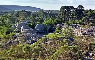 Sierra de los Padres is a string of rocky hills and ridges about 14 miles west of Mar del Plata. They are part of Tandilia's mountain range, actually a series of low rock-strewn elevations of precambrian origin[1] extended from central Buenos Aires Province to Cabo Corrientes, a cape on the shores of Mar del Plata. These peaks are barely 270 mt (900 feet) high, surrounded by farms in the lower lands and by an exclusive neighborhood built on their slopes. Most local landscapes have panoramic views of the surrounding hills. Recreational activities include trekking, PPC, bouldering and a large Golf link. There is an annual trekking and climbing event organized by the "Club Andino Mar del Plata", with more than 300 climbers attending each October.[2][3]