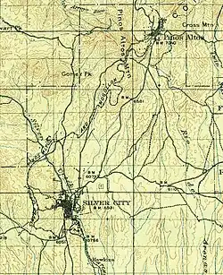 Silver City, Pinos Altos and Mogollon Railroad (SC, PA&M) was a 2 ft (610 mm) narrow gauge railway serving copper mines along the Continental Divide[1] in the mountains of southwestern New Mexico. The communities of Silver City and Pinos Altos developed as 19th century miners recovered easily extracted gold and silver from ore deposits of the area. Standard-gauge Santa Fe Railroad reached Silver City in 1886, and SC, PA&M was incorporated 24 August 1889 to build a railway north to Mogollon, New Mexico. Construction was limited to 5 miles (8.0 km) of grading[2] until Wisconsin-based Comanche Mining and Smelting purchased the railroad and the Pinos Altos mining claims of George Hearst in 1903[3] after horse-drawn ore transport became uneconomical. The Silver City smelter burned shortly after purchase, but was rebuilt with three blast furnaces and a reverberatory furnace to handle 225 tons of ore per day.[4] Two Shay locomotives were moved to Silver City in August 1905 from the Gilpin tramway of Gilpin County, Colorado.[5] The railroad was built through iron and limestone mines on Chloride Flat west of Silver City.[4] The limestone was used as a flux for smelting the copper ore.[2]