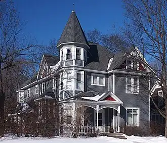 The Simon Weldele House is a wood frame building rising two and a half stories. It is irregular in plan, with multiple gables emerging from a hip roof, and a polygonal corner tower. Elements of Queen Anne style include the wraparound porch with turned posts, fretwork gable panels, stained glass, and polychrome exterior.[3]