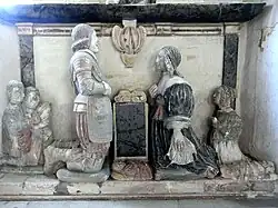 Effigies of Sir John Northcote, 1st Baronet (1599–1676) and his wife Grace Halswell (died 1675). Detail from base of monument to his father John Northcote (1570–1632), Newton St Cyres Church. On a cartouche above are shown the arms of Northcote impaling Azure, three bars wavy argent overall a bend gules (Halswell). Their sons are shown kneeling behind their father and their daughters behind their mother. the effigies of some infants of both genders lie on the floor in swaddling clothes