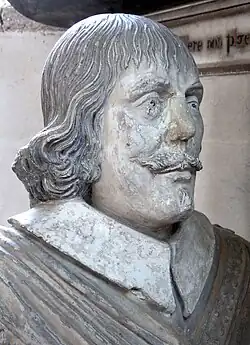 Sir John Northcote, 1st Baronet (1599–1676), detail of his kneeling effigy at base of monument he erected to his father John Northcote (1570–1632) in Newton St Cyres Church, Devon
