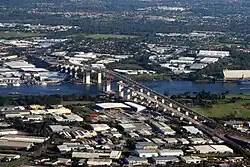The Sir Leo Hielscher Bridges, formerly and still collectively referred to as the Gateway Bridge, are a pair of twin road bridges that carry the Gateway Motorway (M1) over the Brisbane River, skirting the eastern suburbs of the city of Brisbane. The western bridge carries traffic to the north and the eastern bridge carries traffic to the south. They are the most eastern crossings of the Brisbane River and the closest to Moreton Bay, crossing at the Quarries Reach and linking the suburbs of Eagle Farm and Murarrie. The original western bridge (formerly named the Gateway Bridge) was opened on 11 January 1986 and cost A$92 million to build.[1][3] The duplicate bridge was opened in May 2010, and cost $350 million.[1]