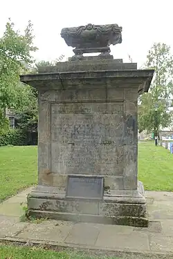 A monument was later erected for Sir Robert Munro in Falkirk churchyard. An entry in the Falkirk Parish Church accounts for October 1750 shows: "Present for the poor from Sir Harry Munro, five guineas, for the privilege of a Tomb upon Sir Robert, my Father, in the Church-yard". With elaborate decoration, and inscriptions in Latin and English language, which were renewed in 1848 and again in 1901, the monument was left in position when neighbouring stones were cleared away a few in years ago. Now, by its latest restoration, it is once more a fitting reminder of the man it commemorates: "Sincere and active in the service of his friends, humane and forgiving to his enemies, generous and benevolent to all, his death was universally regretted even by those who slew him."[8]