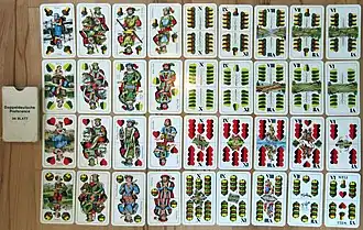 The choice of card deck varies from region to region, but the game is usually played with French-suited cards or double German cards. For tournaments in which players of different regions compete, there are special German–French decks. Sechsundsechzig is played with a pack of 24 cards.