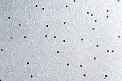 The telescope's imaging camera is made up of 30 CCD chips, each with a resolution of 2048 × 2048 pixels, totaling approximately 120 megapixels.[11] The chips are arranged in 5 rows of 6 chips. Each row has a different optical filter with average wavelengths of 355.1 (u), 468.6 (g), 616.5 (r), 748.1 (i), and 893.1 (z) nm, with 95% completeness in typical seeing to magnitudes of 22.0, 22.2, 22.2, 21.3, and 20.5, for u, g, r, i, z respectively.[12] The filters are placed on the camera in the order r, i, u, z, g. To reduce noise, the camera is cooled to 190 kelvins (about −80 °C) by liquid nitrogen.