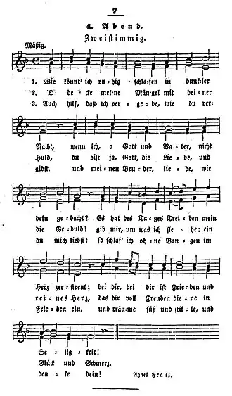 In the first publication, the poem has six stanzas of four lines each, with the final stanza repeating the first as an affirmation. The rhyme scheme fit no traditional hymn tune. Friedrich Silcher wrote a melody published 1843 a collection Zwölf Kinderlieder für Schule und Haus, zwei- drei- und vierstimmig componiert (Twelve children's songs for school and home, composed for two, three and four parts).[6] It was combined with the text "Wie könnt ich ruhig schlafen in dunkler Nacht, wenn ich, o Gott und Vater, nicht dein gedacht?" (How could a sleep peacefully in dark night if I had not thought of you, o God and Father), an evening prayer for children by Agnes Franz. It is not known when Hausmann's text was combined with Silcher's melody. In 1870 at least both were firmly together, now as three stanzas of eight lines each due to the longer melody.[7]