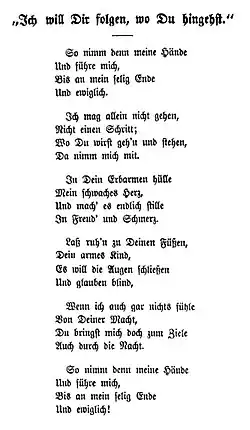 The exact date and reasons for "So nimm denn meine Hände" are not known. The poetry expresses faith in the guidance by an addressed "You". The Biblical header, "Ich will Dir folgen, wo Du hingehst" (I will follow you wherever you go, Luke 9:56–57) identifies the You as Jesus. This quotes a follower of Jesus, who promises to follow unconditionally.[4] Another Biblical reference may be the story of Martha and Mary, Luke 10:38–42), with Mary listening to Jesus in a position at his feet as the fourth stanza describes.[4] Legend has it that Hausmann wanted to marry a missionary in Africa, but found him dead when she arrived.[5]