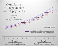 Now the rate of flow of purchasing-power to individuals is represented by A, but since all payments go into prices, the rate of flow of prices cannot be less than A+B. The product of any factory may be considered as something which the public ought to be able to buy, although in many cases it is an intermediate product of no use to individuals but only to a subsequent manufacture; but since A will not purchase A+B; a proportion of the product at least equivalent to B must be distributed by a form of purchasing-power which is not comprised in the description grouped under A. It will be necessary at a later stage to show that this additional purchasing power is provided by loan credit (bank overdrafts) or export credit.[22]: 22–23