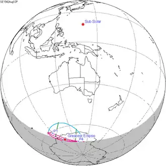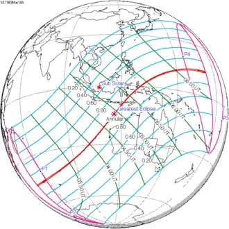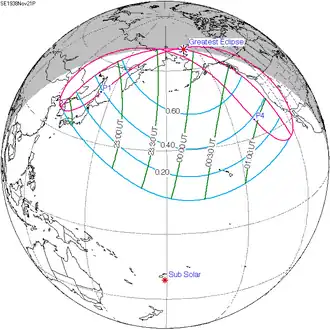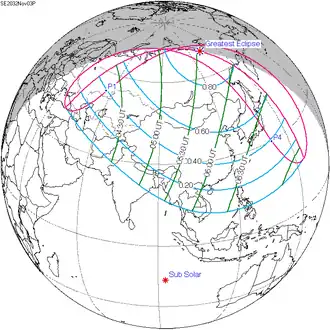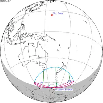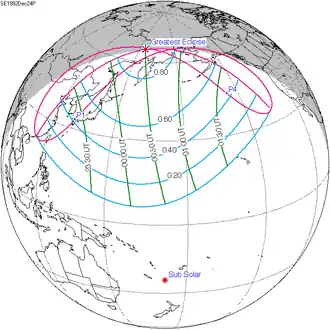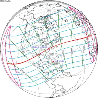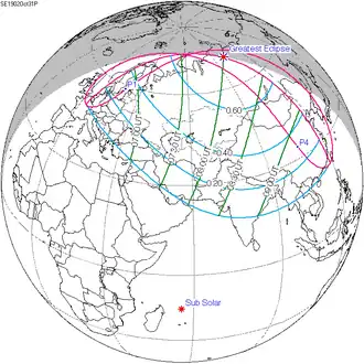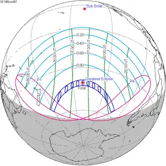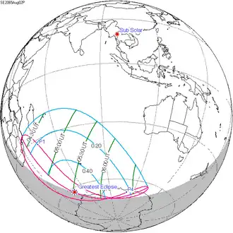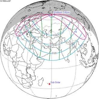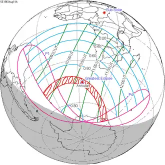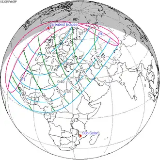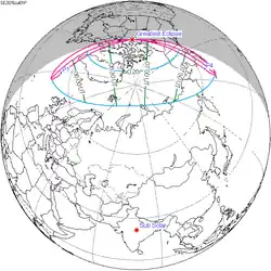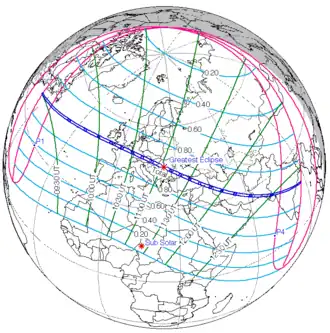 The greatest eclipse occurred at 08:51 UTC in northern Sweden. At that time, the axis of the Moon's shadow passed a mere 510 km above Earth's surface.[4]
