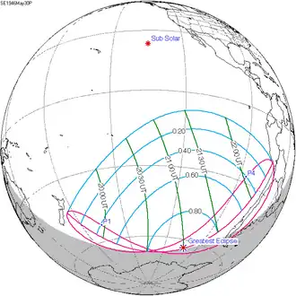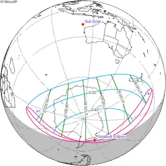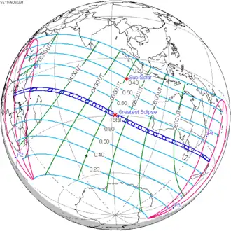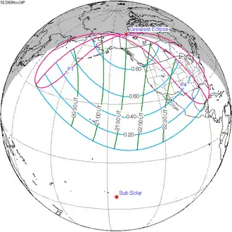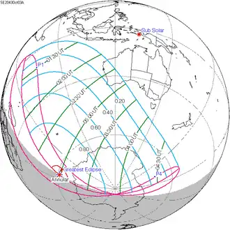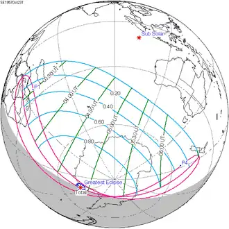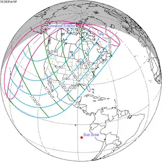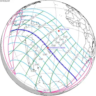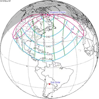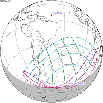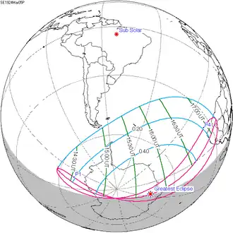 Shown below are two tables displaying details about this particular solar eclipse. The first table outlines times at which the moon's penumbra or umbra attains the specific parameter, and the second table describes various other parameters pertaining to this eclipse.[5]