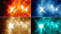 An X3.2-class solar flare observed in different wavelengths. Clockwise from top left: 304, 335, 131, and 193 Å