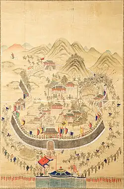 Upon their arrival, Song Sanghyŏn urged Yi Kak to remain within Dongnaeeupseong and to lead a coordinated defense.[77] Yi Kak, however, adhered to the operational doctrines of the Chesŭng Pangnyak system, which prescribed that Provincial Military Commanders were to engage enemy forces outside fortress walls in maneuver warfare, rather than being confined to static defense.[78] In accordance with these principles, Yi Kak declined Song's entreaty, withdrew from the fortress, and went to the strategic rear zone of Sosan (소산; 蘇山[79]) to establish his encampment. He left Song and the remaining defenders behind to face the impending Japanese assault on their own.[77][63]