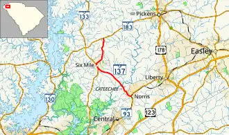 SC 137 begins at an intersection with SC 93 (Norris Drive) in Norris, within Pickens County, where the roadway continues as East Jamison Street. It travels to the northwest and crosses over Twelve Mile Creek just north of Cateechee. In Six Mile, the highway intersects SC 133 (South Main Street). The two highways travel concurrently until Six Mile Cemetery, where SC 133 splits off onto Mt. Olivet Road. SC 137 travels to the north-northeast. It passes Six Mile Elementary School on the northeastern edge of the town. A short distance later, it meets its northern terminus, an intersection with SC 183 (Walhalla Highway).[2]