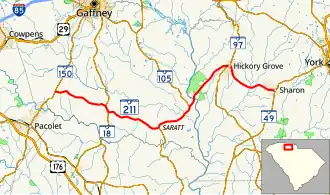 SC 211 begins at an intersection with SC 150, north of Pacolet in Cherokee County, going easterly along Asbury Road to Asbury, where it connects with SC 18. Splitting from SC 18 onto Gowdeysville Road, it connects with SC 105 in Saratt. Solo again, when it splits from SC 105 with Hickory Grove Road, it crosses the Broad River and into York County. At Hickory Grove, it connects briefly with SC 97, before continuing southeasterly to Sharon, where it ends at an intersection with SC 49.[3]