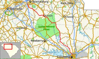 SC 215 is a two-lane rural highway that traverses for 95.7 miles (154.0 km) from Columbia to Spartanburg; connecting Jenkinsville, Carlisle, Union, and Roebuck.[6]
