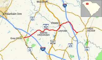 South Carolina Highway 92 (SC 92) is a 16.46-mile-long (26.49 km) state highway in the U.S. state of South Carolina. The highway connects Gray Court with the Enoree area.