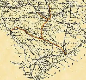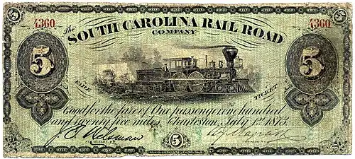 The South Carolina Rail Road Company was a railroad company that operated in South Carolina from 1843 to 1894, when it was succeeded by the Southern Railway. It was formed in 1844 by the merger of the South Carolina Canal and Rail Road Company (SCC&RR) into the Louisville, Cincinnati and Charleston Railroad Company. It was built with a track gauge of 5 ft (1,524 mm).[2]