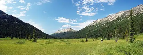 The Engelmann Spruce-subalpine fir zone (ESSF), located below the tundra, is a continuous forest composed of conifers with Engelmann spruce, alpine fir in drier sites, and white bark pine and lodgepole pine in wet sites.[7] The most common shrub found in this zone is the white-flowered rhododendron, followed by black huckleberry, grouseberry, and false azalea.[7] The meadows are dominated by heath, flowers and grasslands.[7] Snow can linger long enough in this zone to provide moisture for the Indian hellebore, arrow-leaved groundsel, paintbrush, sitka valerian, and many other herbs.[7]