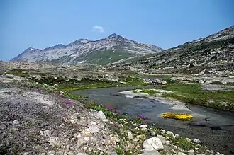 The alpine tundra is the highest elevation of the mountain range, and dominates the area by 60%[6] and is accompanied by permanent snow, glaciers and large areas of bare rock, giving a short growing season for dwarf-like plants that grow small and have short flowering periods.[7]