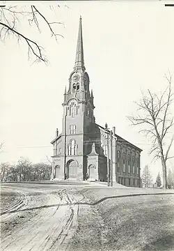 The current structure (pictured above right) was built in 1860 on the same spot as the meeting house of 1788 and dedicated on January 2, 1861. The church, a Romanesque Revival, was designed by John Stevens and cost about $19,000.[3]