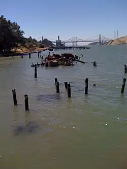 Garden City attempted an eastbound bay crossing during a full gale on Christmas morning, 1921. After steaming into the wind for 90 minutes on what was normally an 18-minute trip, the ferry found its destination slip was occupied by the ferry Edward T. Jeffery seeking shelter from the storm. The other ferry vacated the slip, but Garden City was unable to maneuver in the wind, and started drifting when its rudder broke while attempting to return to San Francisco. A rescue tug arrived and took the ferry in tow, but the tow line parted, and the ferry drifted into the Key system pier. The pier was seriously damaged and the ferry passengers were drenched by waves breaking 20 feet high as they crawled to safety. Southern Pacific retired Garden City the following year; but traffic remained so heavy through the 1920s that the boat was repeatedly pulled out of retirement for temporary service when other boats needed repair. After her last run in 1929, the old ferry was moored as a fishing resort in Eckley, California. Eckley is gone, the site now being part of Carquinez Strait Regional Shoreline Park, and the remains of the Garden City are easily visible from the park's Eckley fishing pier.[27]: 162–166