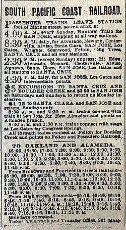 - ^ "South Pacific Coast - The New Narrow-Gauge Route to Santa Clara, San Jose and Santa Cruz," The Morning Times, p. 3, July 28, 1878, Oakland, California.