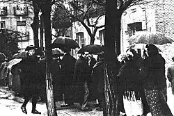 In early April the president Alcalá-Zamora was deposed. Some conspirators thought it a first step towards revolutionaries taking over power; Galarza asked Alcalá not to step down and offered military support, but it is not clear whether he represented other plotters.[27] Others remained skeptical, e.g. on April 12 Franco sent a dilatory note.[28] On April 14 celebrations of anniversary of the Republic turned into riots and a respected right-wing Guardia Civil commander was killed; his funeral two days later turned into a large anti-governmental demonstration. This has probably prompted the conspirators to act. On April 17 Rodríguez del Barrio, González Carrasco, Varela and Orgaz set April 20 as the date of the rising. Its details remain rather obscure, apart that Varela was to seize the Ministry of War and Orgaz to lead sub-units taking control of Capitania General.[29] However, at least some of those involved had second thoughts, as they were well aware of rather sketchy and improvised nature of the scheme. On April 18 del Barrio claimed health problems – at the time his cancer was well advanced – and withdrew.[30] The coup was cancelled in the last minute.[31]