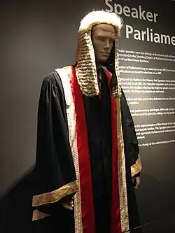 The speaker is second in the line of succession for the office of President of Singapore. Should the president's office be vacant, and the chairman of the Council of Presidential Advisers is unable to take up the role, the speaker will assume the duties of the president until a new president is elected.[6] In terms of state protocol, the speaker sits at the same level as the chief justice of Singapore.[2]