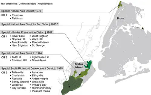 The Special Hillsides Preservation District was created in 1987 by the City of New York to preserve the hilly terrains of the North Shore of Staten Island. The district maintains different planning rules to the rest of the City to account for the geological and bio diversity of the area.[1] The district's goals are to reduce hillside erosion, landslides, and excessive storm-water runoff by conserving vegetation and protecting natural terrain; preserve hillsides with unique aesthetic value; protect areas of outstanding natural beauty; and protect neighborhood character.[2]