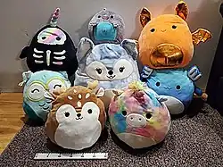 Squishmallows is a brand of stuffed toy that was launched in 2017 by Kelly Toys Holdings LLC and is owned by Jazwares, a Berkshire Hathaway company.[1] Squishmallows are round and come in a variety of colors, sizes, animals/foods/objects, and textures. The brand has created over 3,000 Squishmallow designs.[2][3][4]
