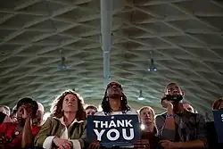 An official White House photo shows a member of the audience holding a "Thank You" sign during President Barack Obama's speech on medicare fraud and health care insurance reform in the auxiliary gym on March 10, 2010.