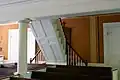 The interior furnishings are mostly of simple design. Slip pews with doors, each labeled with roman numerals, span the nave in four sections and extend along each side to frame the chancel. A balustrade with turned balusters spans the three sides of the chancel, opening with two gates at the back wall on each side. The gallery extending across the rear of the nave is accessed by a central staircase. Two flights rise along the back wall from each door to a shared landing, where a flying stair continues up to the gallery floor.