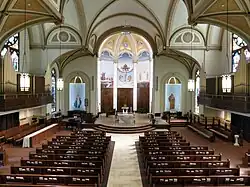 By 1839, the Catholic community in Wapakoneta had grown to the point that it could be created a separate parish,[5] and the members built a small frame church on the southeastern corner of the intersection of Pearl and Blackhoof Streets near the city's downtown. Although no resident pastor served the parish in its earliest years, membership grew during the 1840s and 1850s, and a priest was first assigned to the church in 1857. The expenses of maintaining even a small church caused the parish to be deep in debt during its earliest years, but it prospered greatly under the pastorate of Joseph Gregory Dwenger, later Bishop of Fort Wayne.[3]: 324 Since 1850, the parish has been served by priests from the Congregation of the Precious Blood.[6]