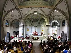 When Fr. A.L. Leininger became pastor of the parish in 1893, the church building was too small for the needs of the parish, despite being enlarged twice before. Rather than adding onto the existing structure, Leininger decided to build a new church in the Italian Renaissance style, similar to St. Peter's and St. Mark's.[3] Work began on the church on January 16, 1897, the cornerstone was laid by bishop John Watterson of Columbus on July 10, 1898, and dedicated by bishop Leo Haid, O.S.B., Vicar Apostolic of South Carolina, on August 27, 1899 as Watterson had died a year prior.[3][5] The distinctive dome of the church has dominated the Zanesville skyline ever since.[5]