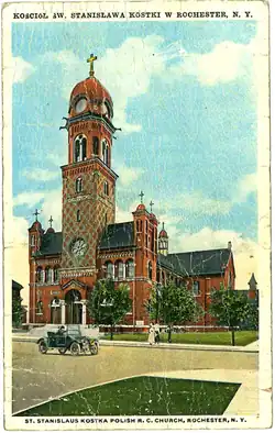 The St. Stanislaus Kostka is a Roman Catholic parish church under the authority of the Roman Catholic Diocese of Rochester, located in Rochester, Monroe County, New York. St. Stanislaus Kostka Church is the distinctive church structure located on the corner of Hudson Avenue and Norton Street in the city's northeast corner. The church is the spiritual home of Rochester's Polish American community. This Catholic church was dedicated in 1909 and replaced a smaller wooden church. The St. Stanislaus grammar school operated from 1897 until 1992.