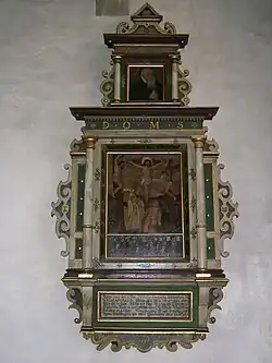 In addition to other grave slabs and funerary shields on and in the church, there are also two wooden epitaphs in the nave. One is dedicated to Ulrich Oberanns, who, among other things, donated the altar cross, the other to Wilhelm Gmelin, the long-time pastor of Gärtringen, who died in 1612. This is located today next to the southern choir arch. It has a three-part structure and is surrounded by Renaissance ornaments. The central panel contains a crucifixion group as the main painting, and below it is a landscape painting of the priest's family. The epitaph was made by Wilhelm's son Johann Georg. When the epitaph made by him was painted, he was already deceased, because a skull was assigned to him in the family picture. The epitaph was painted by Wilhelm's grandson, Magister Wilhelm Schickard, who, being versatile, is also considered to be the designer of the first functioning mechanical calculating machine.[14]