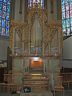 In the course of the church renovation in 2009, two stops were added to the Hauptwerk. In addition, the organ was given a new large pedalboard movement, so that the bass movement - previously also the pedalboard - now became exclusively the manual movement.[16] Since 2009, the slider chest instrument has 32 stops on three manual movements and pedalboard. The actions are mechanical, the stop action is additionally electric and connected to a setting system. The temperament is unequal temperament according to Kirnberger II. The organ has the following stoplist (for the individual stop names, see the list of pipe organ stops):[15][17]