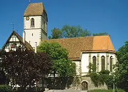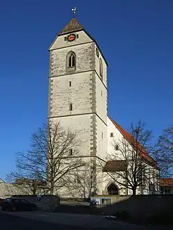 The County Palatine of Tübingen were the patronage lords of the church until the late 14th century. This function was taken over in 1382 by the House of Württemberg, which in 1456 transferred the associated rights to Herrenberg abbey, into which the church was incorporated in 1457.[1] After the exiled Duke Ulrich returned to Württemberg in 1534, he soon introduced the Reformation and Protestant worship. The House of Württemberg had the monasteries and convents in its domain dissolved and again exercised church rights directly itself. The Protestant regional church took over the last Catholic pastor, Eustachius Kain, into its service.[5]