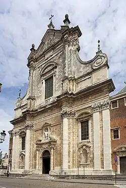 The stone façade was inspired by the Church of the Gesù in Rome. The structure of the church consists of an aisled nave of seven bays and built-in choir with one bay and an apse. The building was constructed with bricks while sandstone was used for the façade.