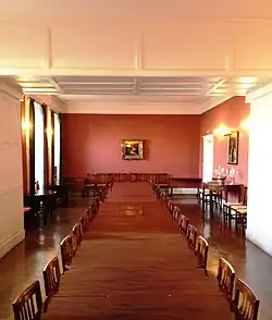 Again unlike the university's constituent colleges, the hall did not have a high table but one common dining table shared by all members. Members of the hall were entitled to invite guests to all meals,[4] with the result that fellows, lecturers, monks, students, and their guests mixed freely. The dining hall was known as the refectory, in accordance with monastic tradition.