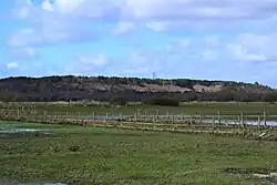 St Catherine's Hill, together with Ramsdown and Blackwater hills, comprise a 3-mile (4.8 km) long ridge running roughly north to south between the Avon and Stour valleys just to the north-west of where the rivers converge in the borough of Christchurch in Dorset.[11][30][31] The top of this ridge is almost a level plateau, 45 metres (148 ft) above sea-level at the southern end and 49 metres (161 ft) in the north. St Catherine's hill, in the south, forms the highest point of this three hill chain at 53 metres (174 ft) and has some of the steepest slopes at 1:1 or 45°.[30][31] The 400 acres (160 ha) site is a mixture of woodland and heath and is part of a larger Site of Special Scientific Interest (SSSI). The eastern slopes and foot of the hill, an area referred to as the Town Common, is almost exclusively open heath and as such has also been designated a Special Protection Area (SPA) and Special Area of Conservation (SAC).[18][31]