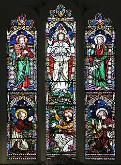 The previously thatched roof has been plain tiles since the extensive restorations of 1863.[6] The east gable of the nave, rebuilt in 1665, is of narrow local brick.[2] The 19th-century west gable end has a gabled double bellcote with two-centred arches and one bell installed. The 19th-century west window has three trefoil lights. The North and South walls of the nave have, in each wall, one window of three cinquefoil lights in ogee arches and square head. The clunch tracery and the mullion and architrave are of limestone, which may indicate they are part of an earlier restoration. The gabled, brick and rubblestone north porch is 19th century. The chancel has in the north wall two windows, each of two cinquefoil lights in four centred arch. The restored east window has three cinquefoil lights and has an original label with mask stops. The windows in the south wall were restored c. 1980.[6]