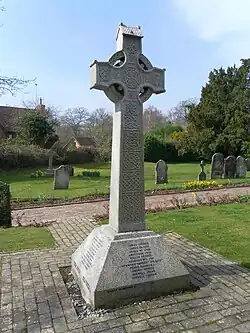 The parish war memorial, a copy of Muiredach's High Cross at the ruined monastery of Monasterboice, Ireland, was put up in 1920[41] and commemorates 33 soldiers who died in World War I.[42] Names from World War II have also been added. Also found in the churchyard are some wood and stone "dead boards", an early type of grave marker that was easier to produce than a headstone. They consist of a wooden board supported on two small stones.[43] Moreover, this churchyard contain two burials in the incident of World War II.[44][45]
