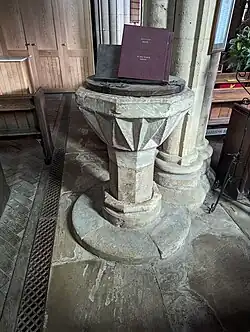 The font is of similar date to the church. There is a worn tablet in the south aisle commemorating Robert and Anne Lovell, who both died in 1421.[1] Other memorials are to Tomlinson Bunting, who died in 1768, and to Joseph and Sarah Hotham, erected in 1791.[3] The register starts in 1538.[5]