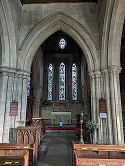 The church is small, measuring 44 feet (13 m) by 32.5 feet (9.9 m). The nave is two bays long, and the chancel a single bay, separated by a chancel arch. There are north and south aisles running the full length of the church. The east window is of three lancets, with a deeply carved surround, while the main west window is a single large lancet. In both aisles are an aumbry and piscina and original windows; the west window of the north aisle has some ancient stained glass. The whole building is covered by a single, pitched, roof.[1][3]